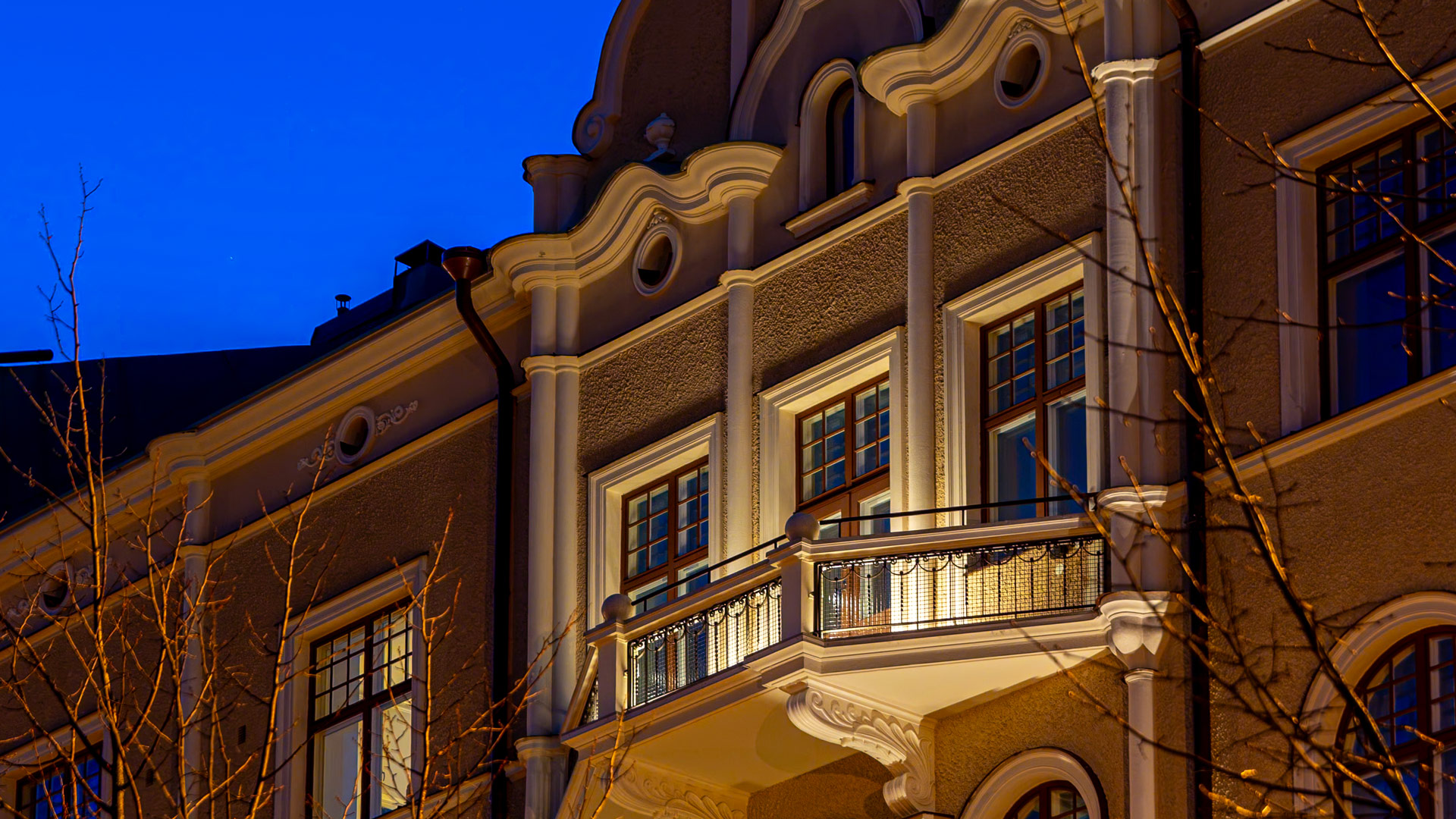Over a hundred years old, Merilinna is an Art Nouveau style residential building located next to Helsinki’s Kaivopuisto Park and is one of the area’s well-known architectural landmarks. During the façade renovation, we designed both façade and courtyard lighting that highlights the building’s historic architecture while also improving practical functionality. Although our initial vision was to illuminate the entire façade, the city only permitted a more limited solution.