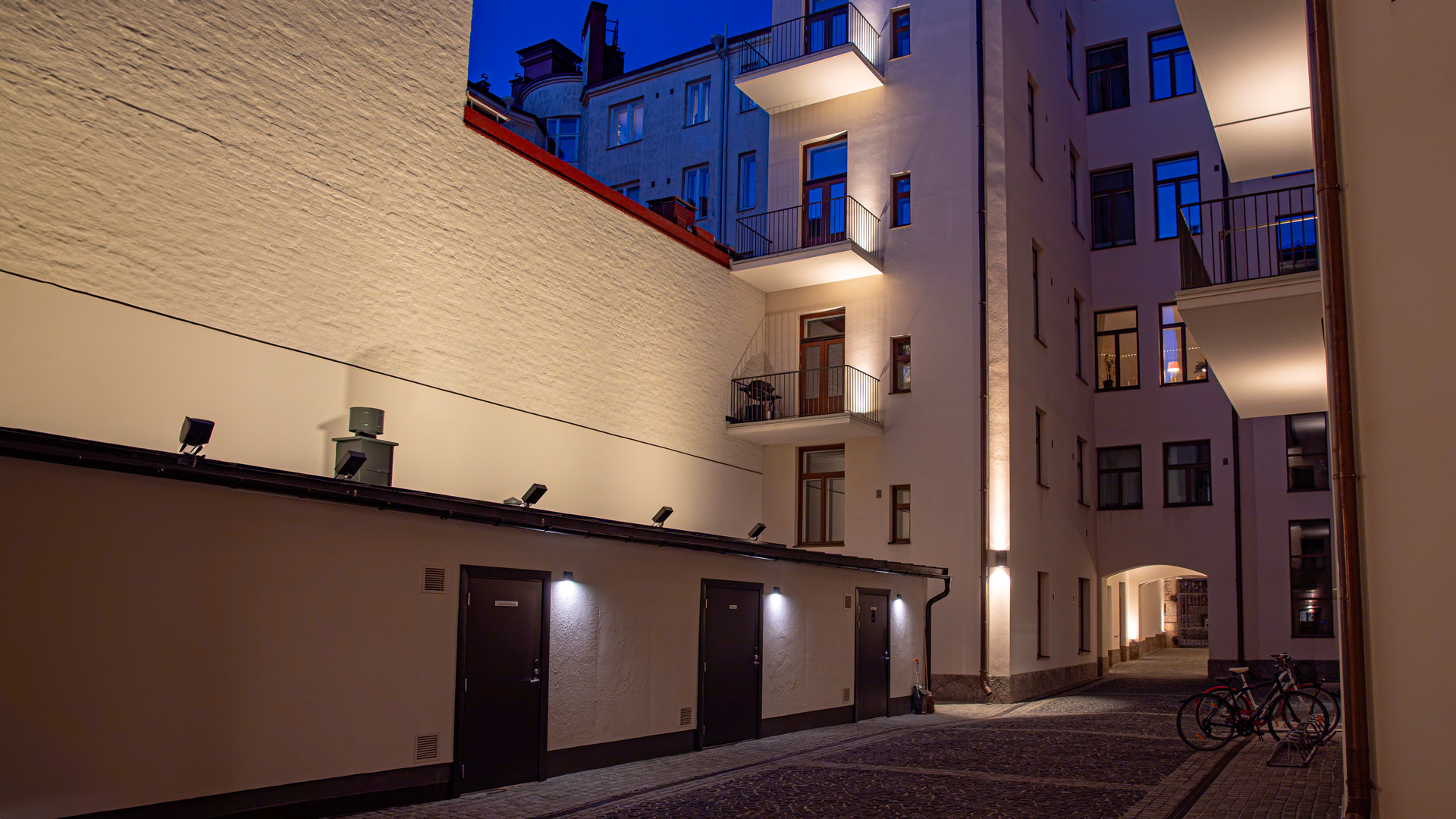 The façade lighting emphasizes the house’s distinctive features and creates a dignified cityscape in the evening. In the courtyard, the lighting design focused on comfort and safety. Special attention was given to illuminating the entrances as well as to clear and elegant number luminaires that guide both residents and visitors. The solution combines architectural expression and practical needs into a harmonious whole.